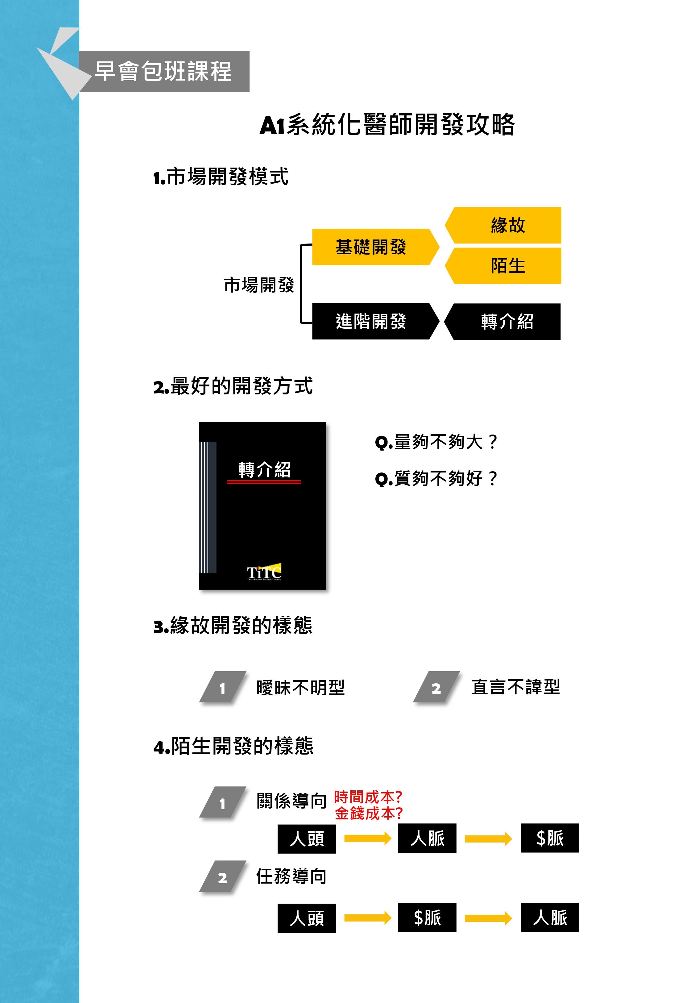 不論是人脈不夠的新人、擁有廣大的緣故市場但想進階到醫師族群的資深業務員,甚至是想發展組織的高手都非常適合上A1系統化醫師開發攻略課程。