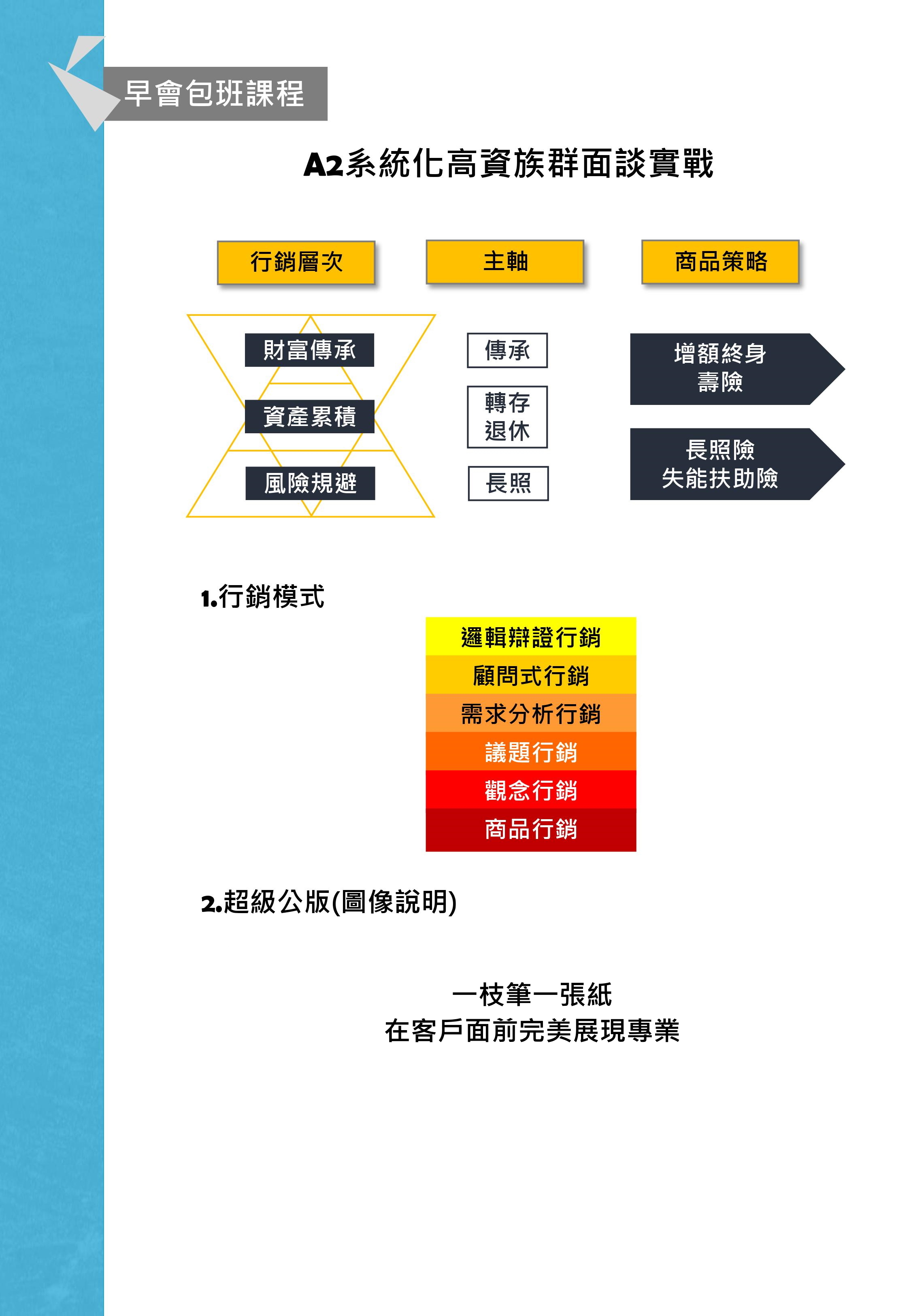 ▲由蕭伯偵總監親自授課,針對高資族群,將行銷流程拆解成清楚的步驟及流程,教會您邏輯辯證行銷直接對準客戶邏輯與他對話,並透過圖像說明,只要一枝筆一張紙就能讓客戶聽懂保險的功能與價值,並對業務員留下深刻的專業印象;不需要5年、10年的資歷,上完課就能下市場用最簡潔有力的語言和高資緣故對談及促成,收回case創造佳績。而系統化的建構更是簡單易懂容易複製的方法,讓增員、訓練有效益的同時還能讓組織倍增。