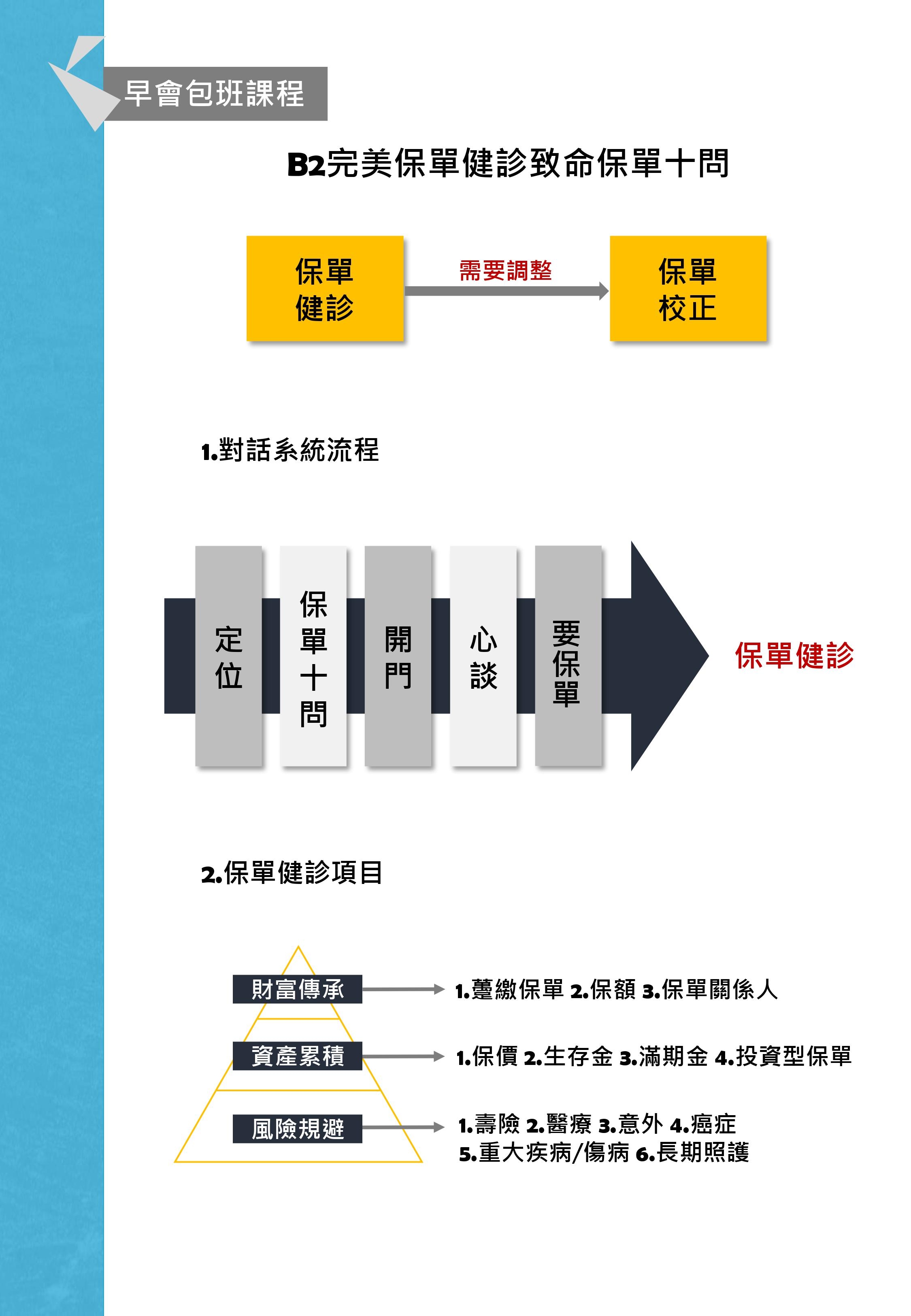 透過課程我們將教您穿越向客戶要保單前的重重阻礙,還有超強的保單十問,問到客戶心甘情願把保單交出來讓您來檢視。當然,這只是第一步,接下來更會教您如何向上提升,從眾多業務員中脫穎而出,不是只是補補醫療實支實付的小缺口,而是客戶上百萬甚至上千萬在資產累積、財富傳承的人生大缺口,讓您輕鬆收大單!