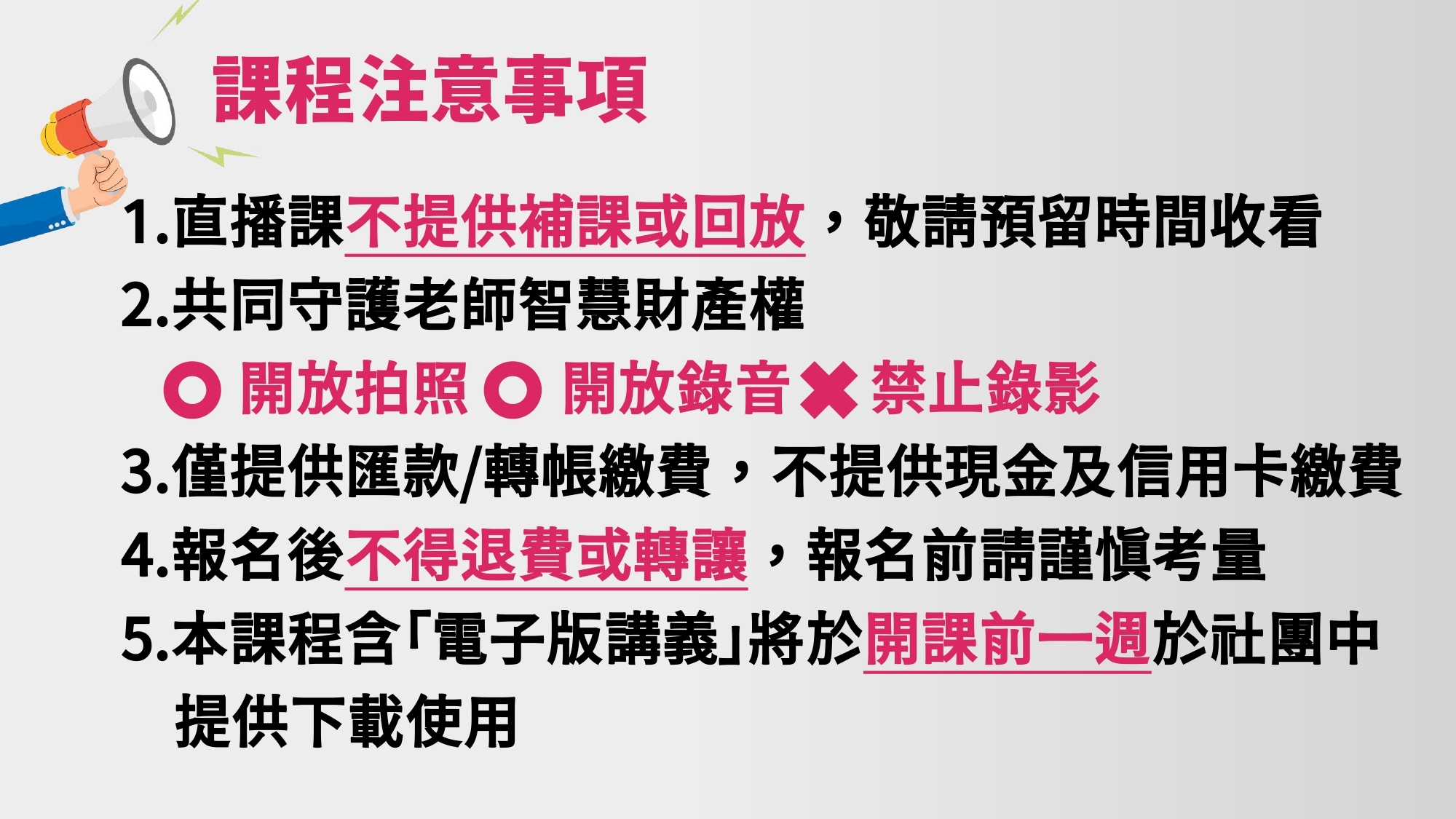 🔴注意!!課前請務必留意您的FB通知(非簡訊)